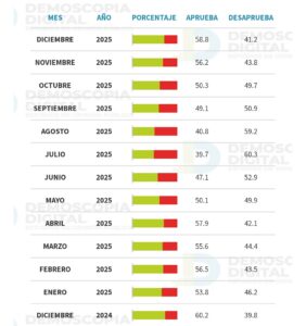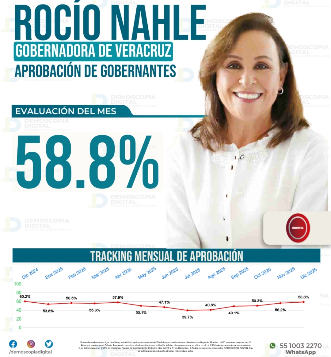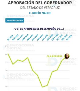 09.01.2026.Veracruz- La más reciente medición de Demoscopia Digital, correspondiente a diciembre de 2025, muestra un incremento significativo en la aprobación de la gobernadora de Veracruz, Rocío Nahle, en el mes de diciembre.