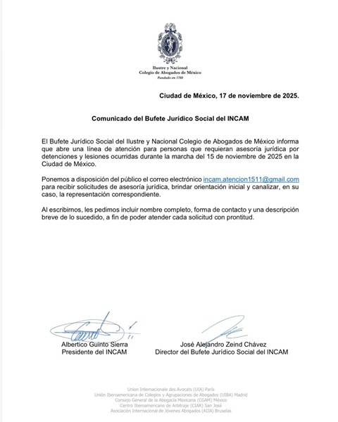 18.11.2025 Ciudad de México.- El Nacional Colegio de Abogados de México, entre otros despachos jurídicos pusieron en marcha un mecanismo de atención para brindar acompañamiento legal a quienes fueron arrestados en el contexto de las recientes protestas encabezadas por integrantes de la llamada “Generación Z” y del “Movimiento del Sombrero”.