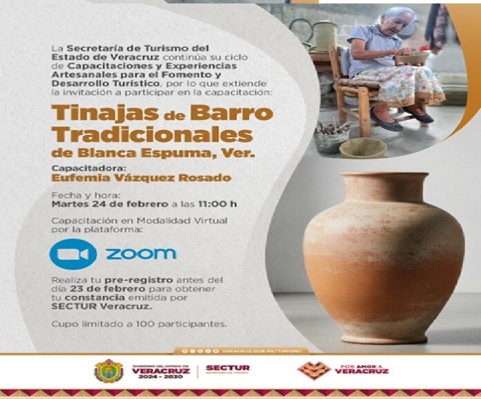 Xalapa, Ver., 12 de febrero de 2026.- La Secretaría de Turismo (SECTUR) continúa con su ciclo de Capacitaciones y Experiencias Artesanales para el Fomento y Desarrollo Turístico, por lo que invita a participar en la capacitación Tinajas de barro tradicionales de Blanca Espuma, que será impartida por Eufemia Vázquez Rosado, de manera virtual, a través de la plataforma Zoom, el martes 24 de febrero, a las 11:00 horas.