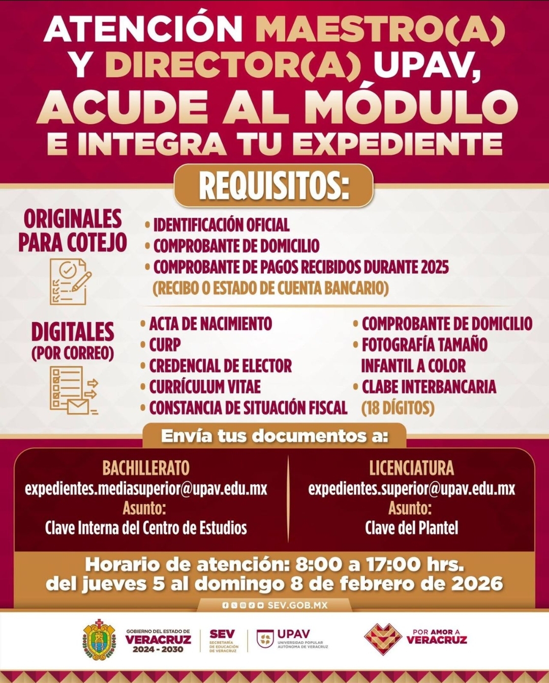 Xalapa, Ver., 04 de febrero de 2026.- La Universidad Popular Autónoma de Veracruz (UPAV) informa la apertura de 12 sedes regionales para la integración y validación de expedientes de maestras, maestros, directoras y directores de la UPAV, quienes deberán acudir al módulo que les corresponda de acuerdo con su región.