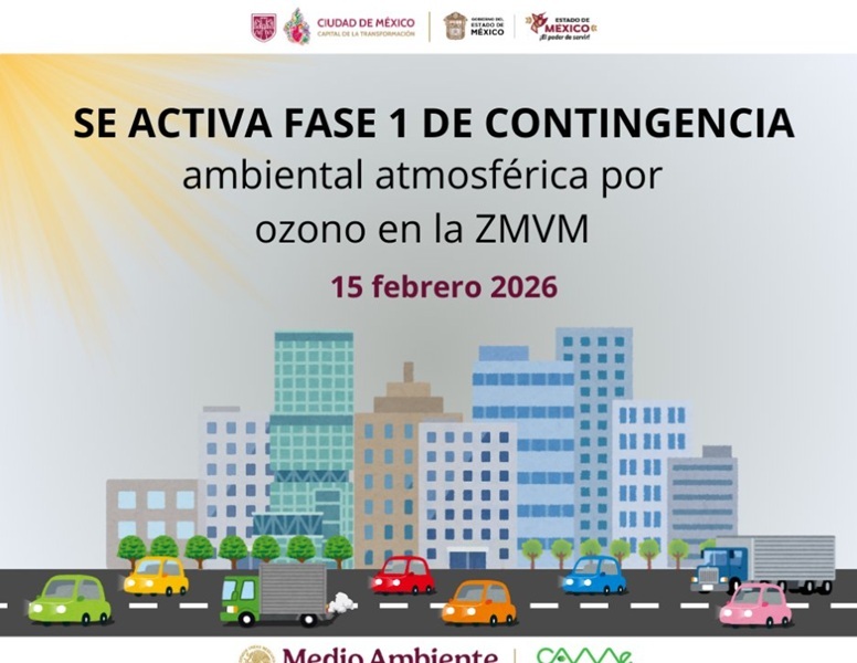 15.02.2026.-Ciudad de México.- La Comisión Ambiental de la Megalópolis informó que este 15 de febrero de 2026, a las 17:00 horas, se activó la Fase 1 de contingencia ambiental atmosférica por ozono en la Zona Metropolitana del Valle de México. La decisión se tomó luego de registrarse concentraciones máximas de 158 y 157 partes por billón en las estaciones Ajusco Medio y Centro de Ciencias de la Atmósfera, ubicadas en Tlalpan y Coyoacán.