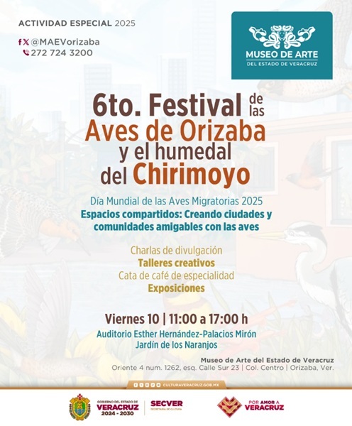 Xalapa, Ver., 09 de octubre de 2025.- La Secretaría de Cultura de Veracruz invita a las actividades del Sexto festival de Aves de Orizaba y el Humedal del Chirimoyo que se realizarán en el Museo de Arte del Estado de Veracruz (MAEV) este viernes, en horario de 11:00 a 17:00 horas. La entrada es gratuita.