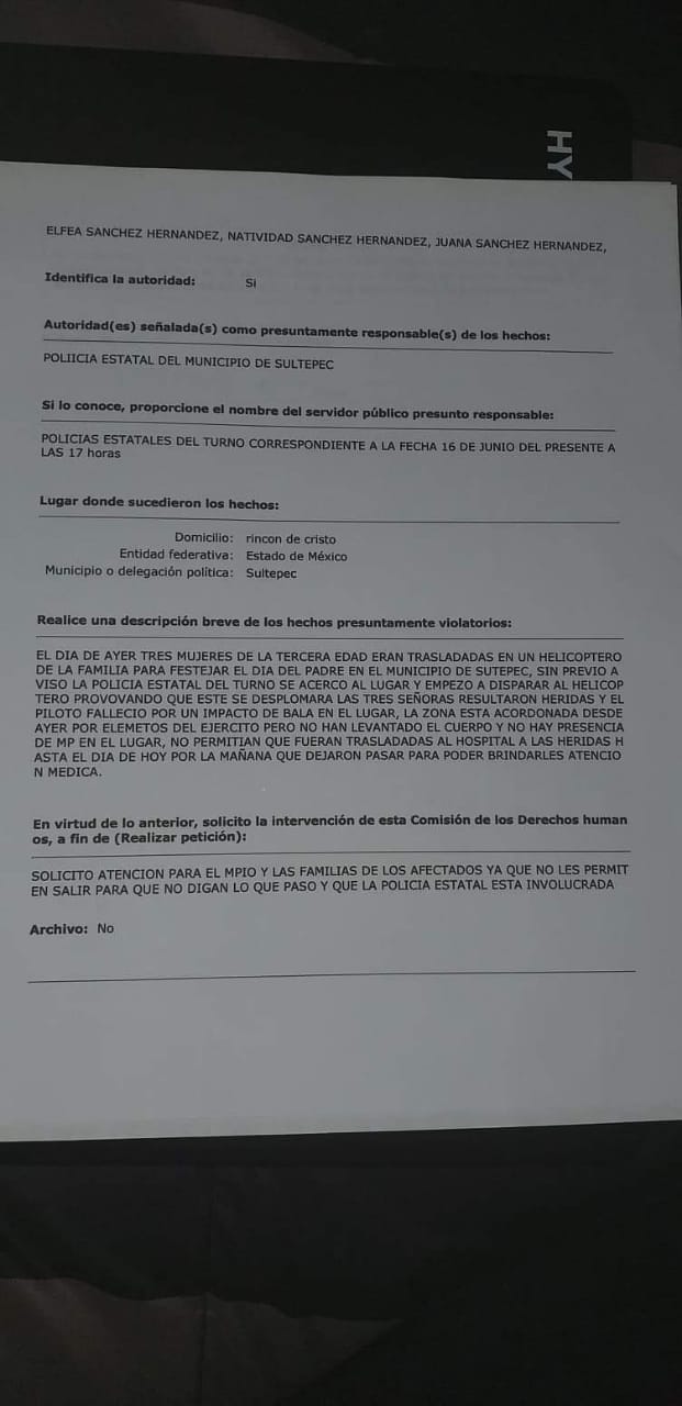 Sultepec, Edomex, 18 junio 2019.- Pobladores de Sultepec y conocidos de las víctimas denunciaron que el helicóptero fue derribado por policías estatales y mataron e hirieron a inocentes, además hicieron llegar a redacciones de distintos medios fotografías y la denuncia ante la CNDH con la verdad de lo ocurrido