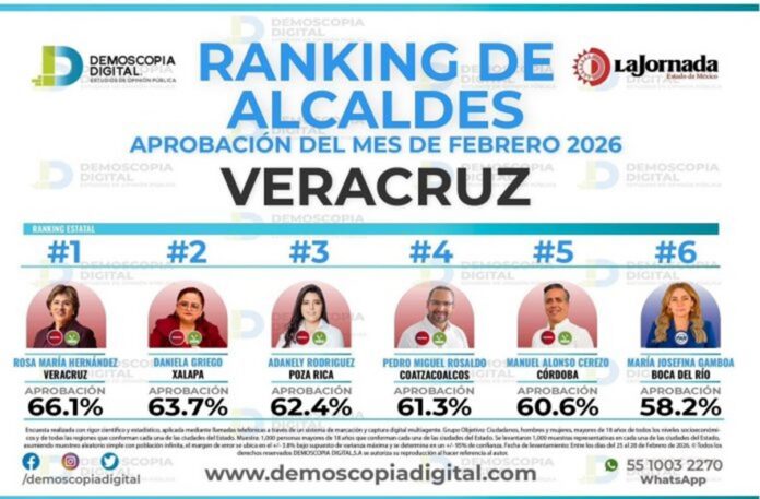 Ciudad de México., 04 marzo 2026.-La prestigiada firma de análisis de mercado y encuestas de opinión “Demoscopia Digital”, reporta en su más reciente estudio de opinión a los alcaldes y alcaldesas mejor evaluadas en el estado de Veracruz en el mes de febrero de 2026, a tan sólo 2 meses de haber iniciado labores.
