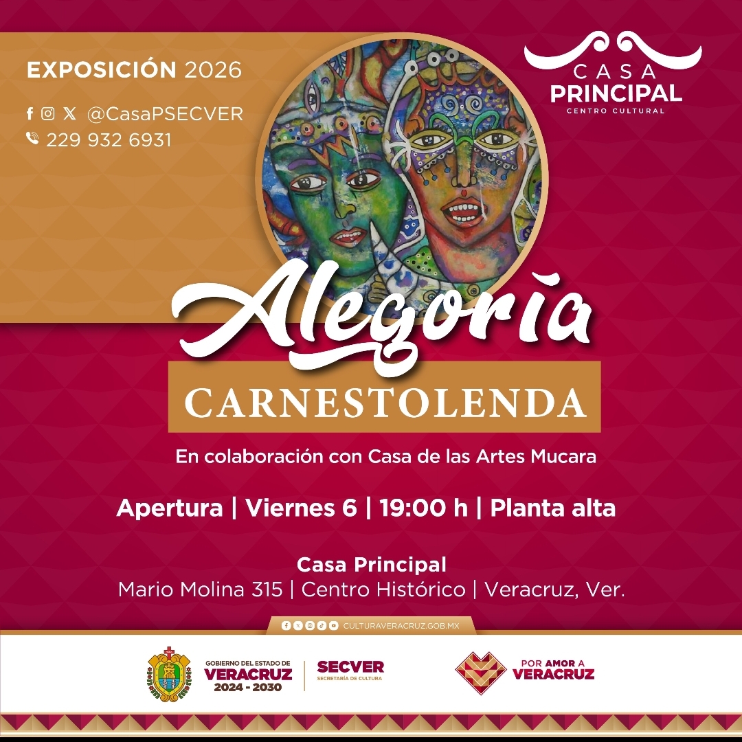 Xalapa, Ver., 05 de febrero de 2026.- La Secretaría de Cultura de Veracruz, en colaboración con Casa de las Artes Múcara, invita a la inauguración de la exposición colectiva Alegoría Carnestolenda, el viernes 06 de febrero a las 19:00 horas, en el Centro Cultural Casa Principal, en el puerto de Veracruz. La entrada es libre.