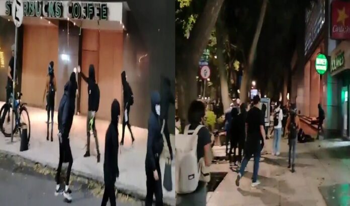 Pese a que el grupo mayoritario ha marchado pacíficamente y lanzado sus consignas pro palestina, el grupo de encapuchados y de negro que siempre acompaña a las marchas ha vandalizado comercios con marcas trasnacionales.