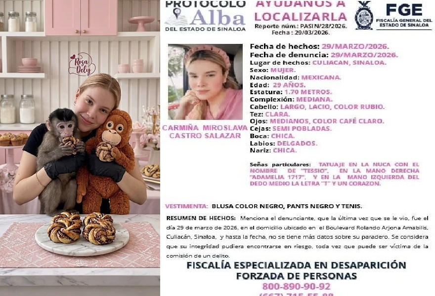 30.03.2026 Culiacán, Sinaloa. El Plagio de la joven influencer y emprendedora gastronómica Carmiña Miroslava Castro Salazar encendió las alertas en Sinaloa luego de que la Fiscalía General del Estado emitiera la ficha de búsqueda PASIN/28/2026, tras reportarse su no localización desde el domingo 29 de marzo.