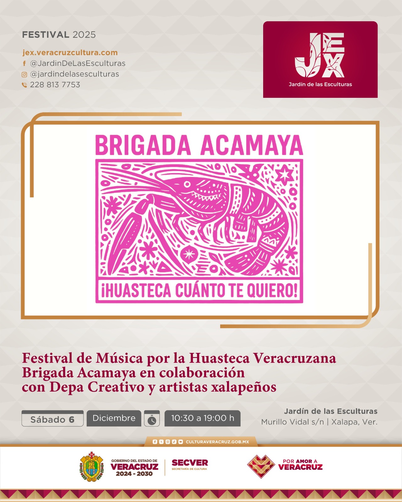 Xalapa, Ver., 04 de diciembre de 2025.- La Brigada Acamaya, el Colectivo Bugambilia y el Depa Creativo invitan al público al Festival de Música por la Huasteca, que se llevará a cabo el día sábado 6 de diciembre en la explanada del Jardín de las Esculturas de Xalapa (JEX), recinto de la Secretaría de Cultura de Veracruz (SECVER), de 10:30 a 19:00 horas.