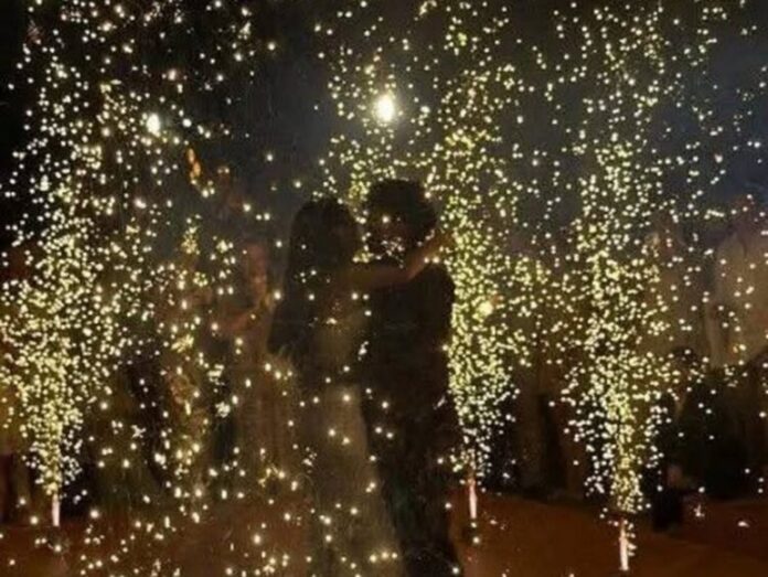 Una de las grandes sorpresas para los novios e invitados fue cuando la noche se iluminó con pirotecnia dorada, lo que elevó la atmósfera festiva, provocando aplausos y emoción entre los asistentes.