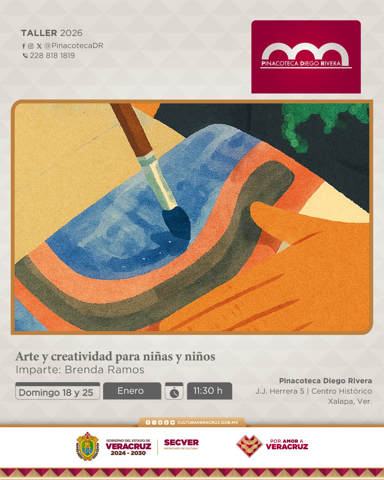 Xalapa, Ver., 09 de enero de 2026.- La Secretaría de Cultura de Veracruz invita al público a asistir a los talleres artísticos durante enero en la Pinacoteca Diego Rivera, enfocados en el desarrollo de la creatividad, la expresión artística y el aprendizaje de técnicas fundamentales de las artes visuales. El cupo es limitado.