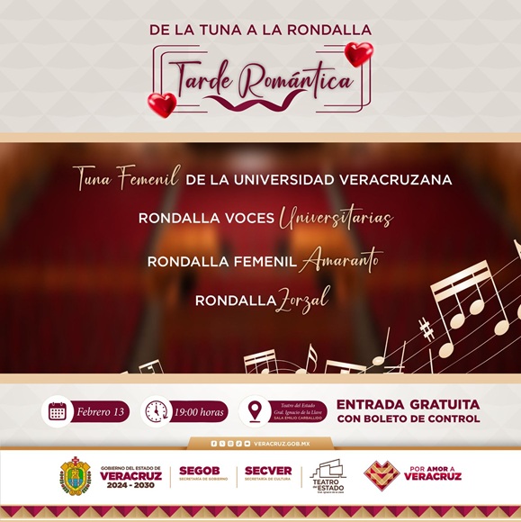 Xalapa, Ver., 12 de enero de 2026.- Con motivo del Día del Amor y la Amistad, la Secretaría de Cultura de Veracruz y la Coordinación de Promoción de los Valores Cívicos y Culturales invitan al público en general a disfrutar del concierto romántico De la Tuna a la Rondalla: Tarde Romántica, este viernes 13 de febrero, a las 19:00 horas, en la Sala Emilio Carballido del Teatro del Estado General Ignacio de la Llave.