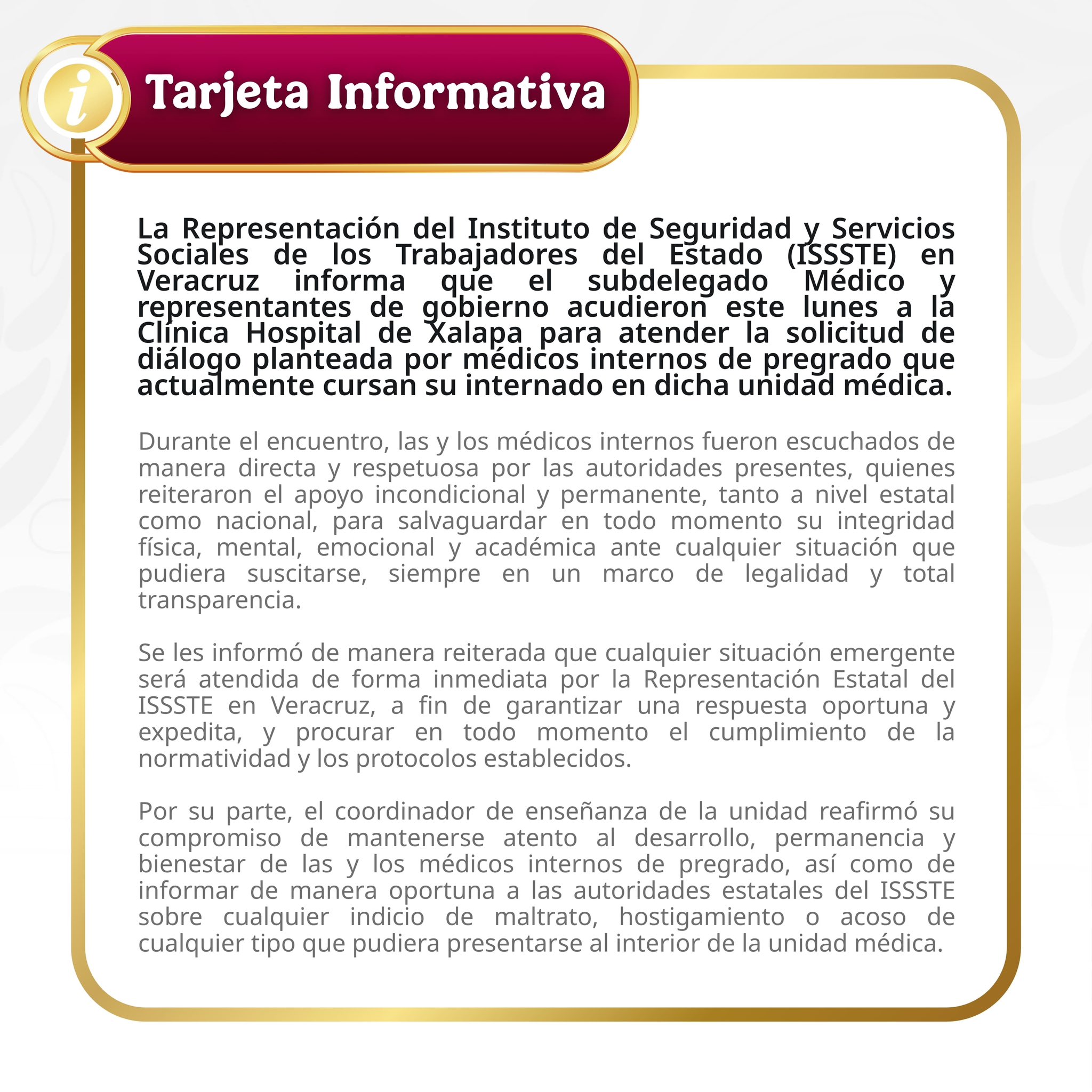 08.02.2026 Xalapa, Ver.- La representación del Instituto de Seguridad y Servicios Sociales de los Trabajadores del Estado en Veracruz informó que este lunes el subdelegado Médico, acompañado de representantes gubernamentales, acudió a la Clínica Hospital de Xalapa para sostener un encuentro con médicos internos de pregrado que realizan su internado en esa unidad y se manifestaron en contra de. Presunto abuso de la dirección.