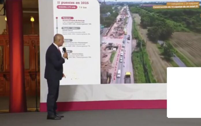 08.2025 Veracruz, Durante la Conferencia del Pueblo, la presidenta de México, Claudia Sheinbaum Pardo, reafirmó su compromiso con el desarrollo de infraestructura estratégica en el país, al presentar los avances en la construcción del puente que forma parte del distribuidor vial de acceso al puerto de Veracruz. Acompañada por el titular de la Secretaría de Infraestructura, Comunicaciones y Transportes (SICT), Jesús Antonio Esteva Medina, la mandataria destacó que esta obra representa un paso fundamental para fortalecer la conectividad logística y comercial en la región.