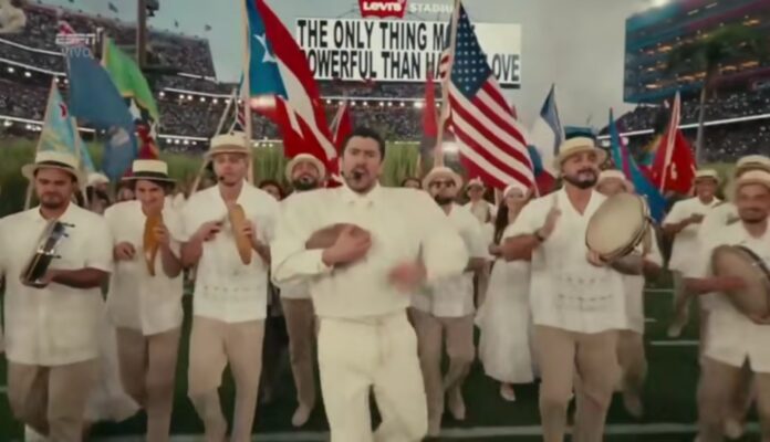 La puesta en escena reunió a músicos de primer nivel y figuras reconocidas como Lady Gaga y Ricky Martin, quienes acompañaron al artista puertorriqueño en un despliegue que buscó visibilizar la fuerza de la comunidad latina en Estados Unidos poniéndolo al centra de la fiesta más americana que existe.