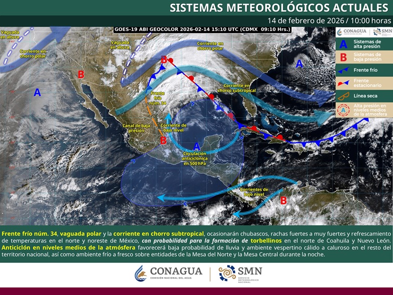 14.02.2025.- El frente frío núm. 34 y una vaguada polar se desplazarán sobre el norte y noreste de México, en interacción con la corriente en chorro subtropical, ocasionarán intervalos de chubascos en Chihuahua y Coahuila, y lluvias aisladas en Nuevo León, además de rachas fuertes a muy fuertes en las regiones mencionadas, así como, refrescamiento de las temperaturas en el noroeste, norte y noreste del país.