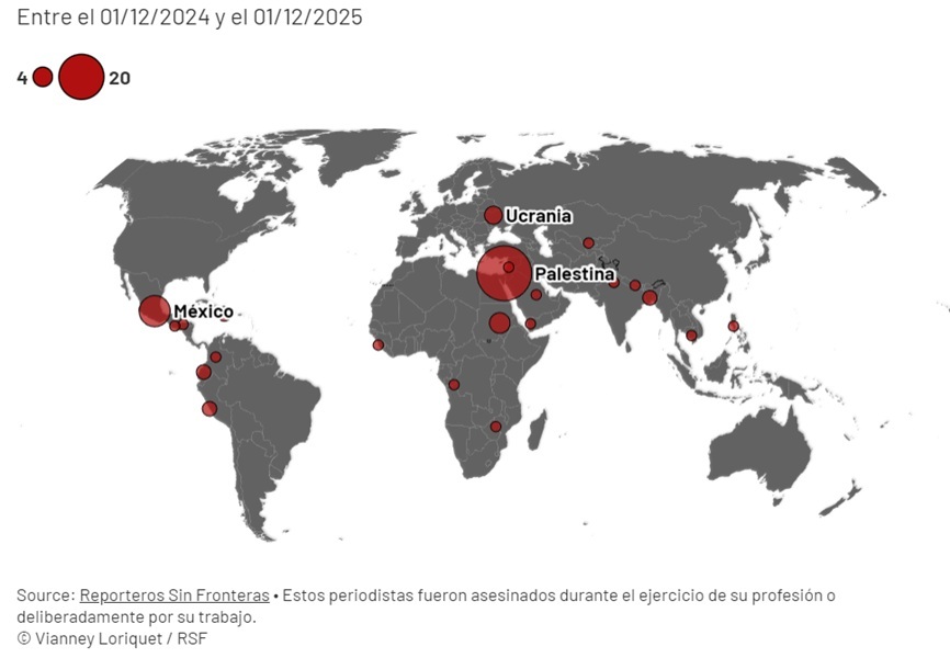 En México, el crimen organizado es responsable de un alarmante recrudecimiento de los asesinatos de periodistas en 2025, el año más mortífero de los últimos tres para este país, que se afianza como el segundo más peligroso del mundo para los periodistas, con nueve asesinatos. Y este fenómeno tiende a extenderse con una “mexicanización” de América Latina: la región concentra el 24 % de todos los periodistas asesinados en el mundo.