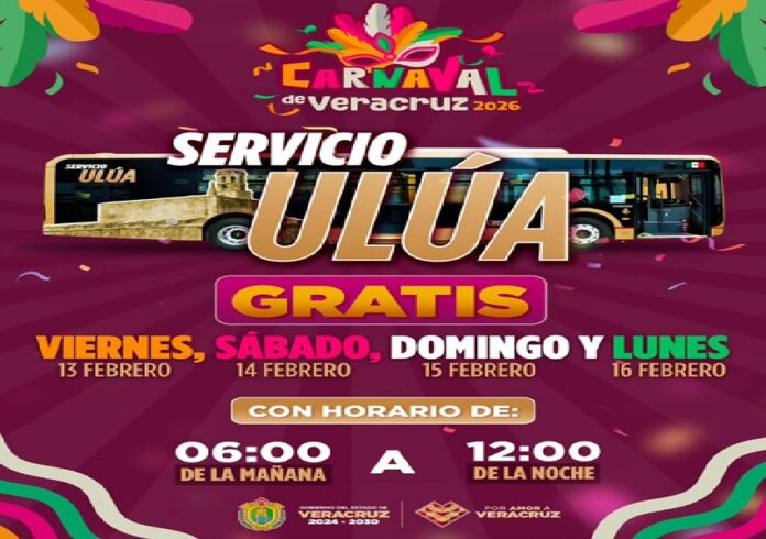 12.02.2026 Veracruz.- El Gobierno y ayuntamiento de Veracruz anunció que durante los días más intensos del Carnaval, el servicio de transporte Ulúa será completamente gratuito. La medida aplicará del viernes 13 al lunes 16 de febrero, en un horario extendido de seis de la mañana a medianoche, con el objetivo de facilitar la movilidad de miles de asistentes que se esperan en la ciudad.