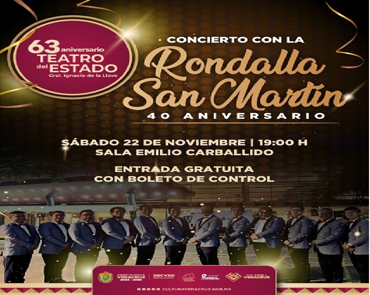 Xalapa, Ver., 19 de noviembre de 2025.- La Secretaría de Cultura de Veracruz (SECVER) invita al concierto que ofrecerá la Rondalla San Martín el sábado 22 de noviembre a las 19:00 horas en la Sala Emilio Carballido del Teatro del Estado General Ignacio de la Llave, como parte de la celebración del 63° aniversario de este recinto cultural. La entrada es gratuita con boleto de control.