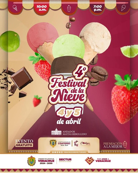 Xalapa, Ver., 01 de abril de 2026.– Esta Semana Santa, la Secretaría de Turismo invita a disfrutar de actividades recreativas en el Pueblo Mágico de Coatepec, como la Feria de la Nieve, que se llevará a cabo los días 04 y 05 de abril en el andador Matías Rebolledo, de 10:00 a 19:00 horas, con entrada gratuita.