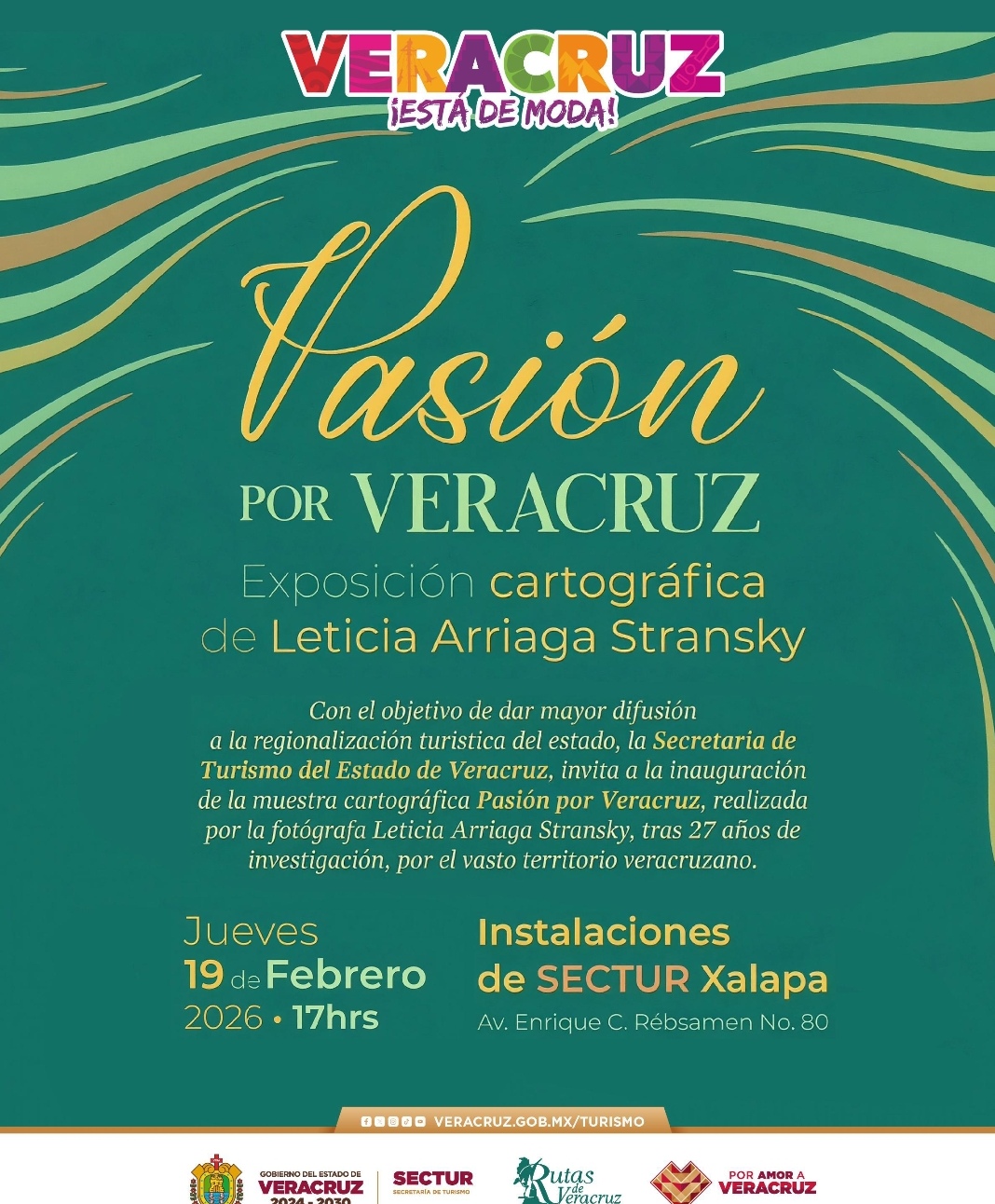 Xalapa, Ver., 19 de febrero de 2026.- La Secretaría de Turismo (SECTUR) inaugurará este día, a las 17:00 horas, la exposición cartográfica Pasión por Veracruz, en sus instalaciones ubicadas en Enrique C. Rébsamen número 80, en Xalapa, como parte de una estrategia integral para fortalecer la promoción y el posicionamiento turístico del estado.