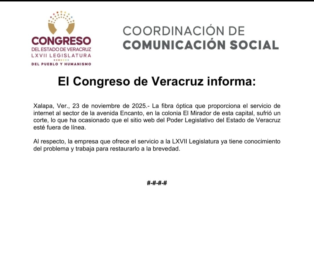 Xalapa, Ver., 23 de noviembre de 2025.- La fibra óptica que proporciona el servicio de internet al sector de la avenida Encanto, en la colonia El Mirador de esta capital, sufrió un corte, lo que ha ocasionado que el sitio web del Poder Legislativo del Estado de Veracruz esté fuera de línea.