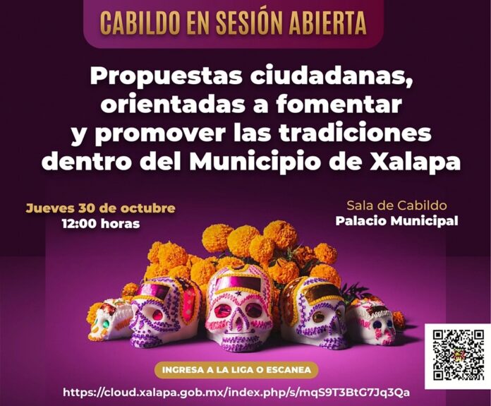 20.10.2025 Xalapa, Ver.- Con el propósito de recibir, escuchar y analizar propuestas ciudadanas orientadas a fomentar y promover las tradiciones en el municipio de Xalapa, el próximo jueves 30 de octubre, a las 12:00 horas, se realizará el quinto Cabildo en Sesión Abierta del año, por lo que se invita a la ciudadanía a participar y presentar sus iniciativas en la materia.