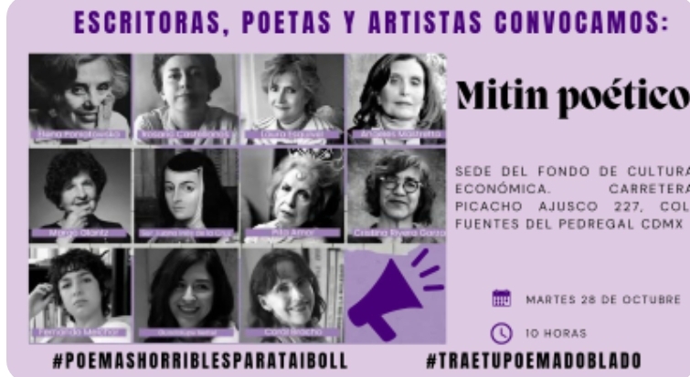 Este martes 28 de octubre a las 10 horas en la sede del Fondo de Cultura Económica, compañeras escritoras, poetas, artistas y colectivas nos manifestaremos con horribles poemas para Taibo.