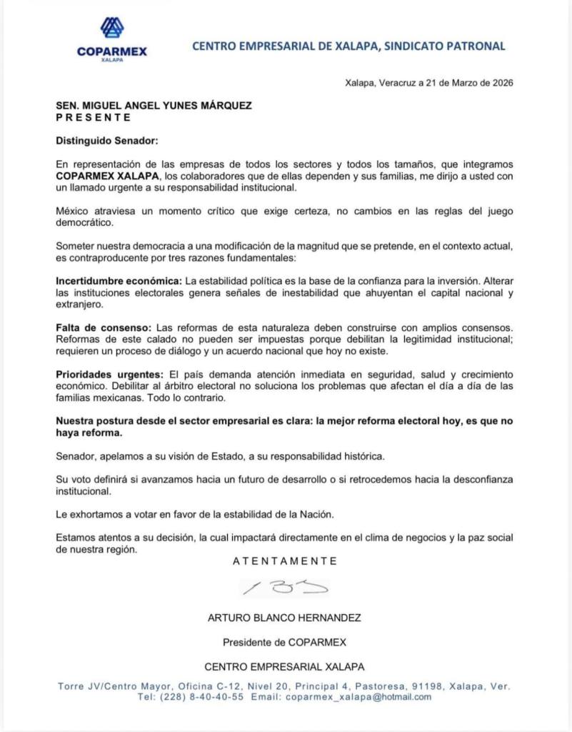El documento, fechado el 21 de marzo de 2026 y firmado por Arturo Blanco Hernández, plantea que México atraviesa “un momento crítico que exige certeza”, advirtiendo que modificar las reglas del sistema democrático en el contexto actual podría generar efectos contraproducentes para la economía, la gobernabilidad y la confianza institucional.