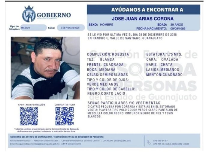 Ciudad de México | Desinformémonos.- El padre buscador José Juan Arias Corona fue reportado como desaparecido en el municipio de Valle de Santiago, Guanajuato, donde buscaba junto con su esposa a su hijo José Juan Arias Solís, joven de 14 años desaparecido el 19 de junio de 2025.