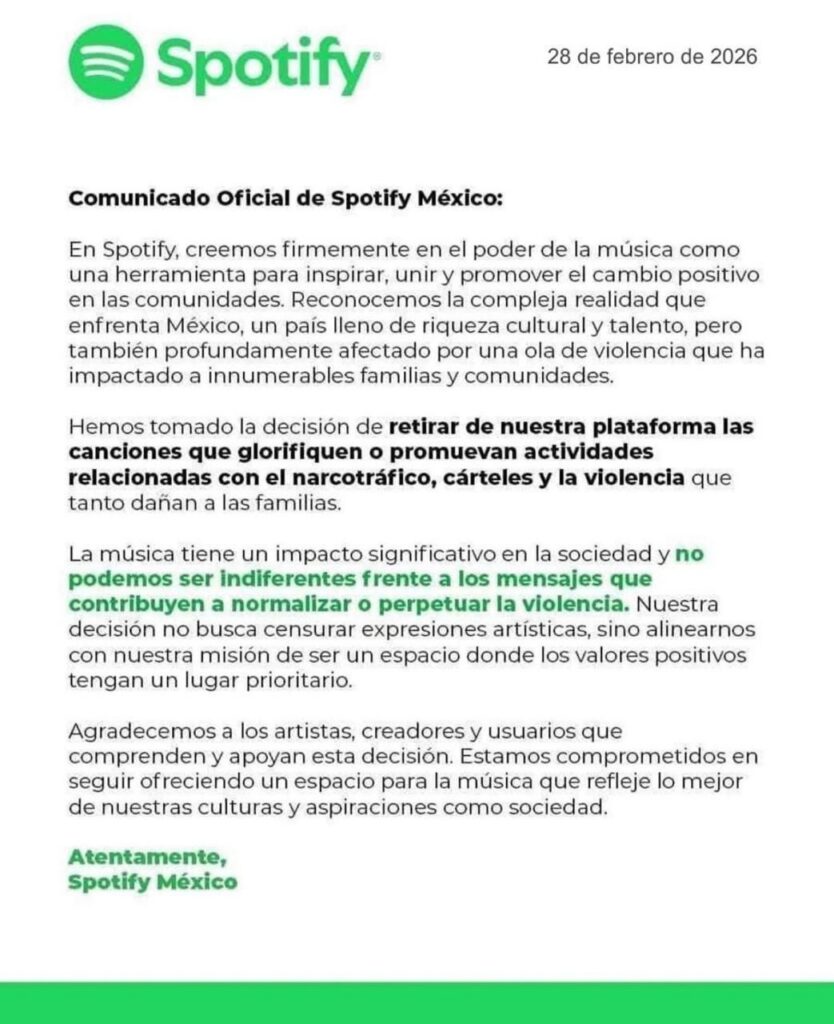 01.03.2026 México.- Un presunto anuncio de Spotify México circuló en redes sociales el 28 de febrero, donde se anunciaba la supuesta eliminación de canciones que promueven el narcotráfico, los cárteles y la violencia.