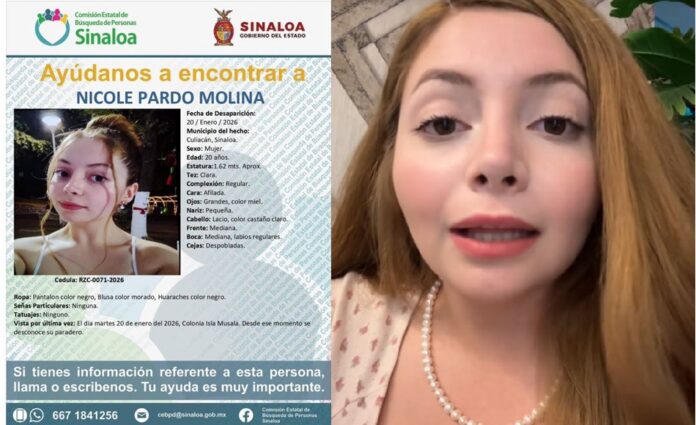 21.01.2026 Sinaloa.- El secuestro de la influencer sinaloense Nicolette Prado Molina, conocida en redes sociales como “La Nicholette”, ha provocado un amplio despliegue de fuerzas de seguridad en Culiacán, Sinaloa, privada de su libertad el miércoles.