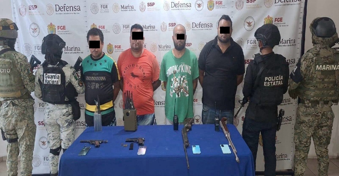 En Coatzacoalcos fueron aprehendidos cuatro hombres por delitos contra las instituciones de seguridad pública y portación ilegal de armas de fuego, a quienes se les aseguraron dos armas cortas, dos rifles de postas, un cargador, cartuchos útiles, teléfonos móviles, inhibidores de señal, radios de comunicación y un automóvil sin reporte de robo.