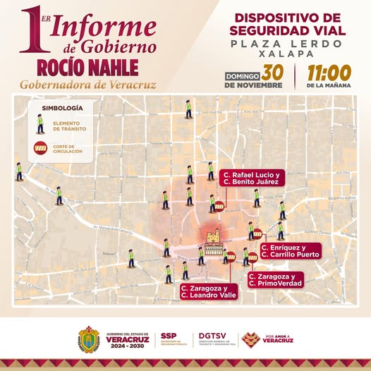 Con motivo del 1er Informe de Gobierno de la Gobernadora de Veracruz, Rocío Nahle, este domingo 30 de noviembre, desplegamos un dispositivo vial en la zona centro de Xalapa.