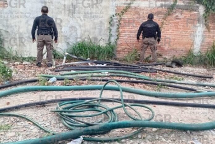 En el primer domicilio, los elementos de la Policía Federal Ministerial (PFM), en coordinación con peritos del Centro Federal Pericial Forense (CFPF), ambos de la Agencia de Investigación Criminal (AIC), aseguraron una cisterna, una motobomba sumergible de succión, un DVR y cinco tramos de manguera de plástico.