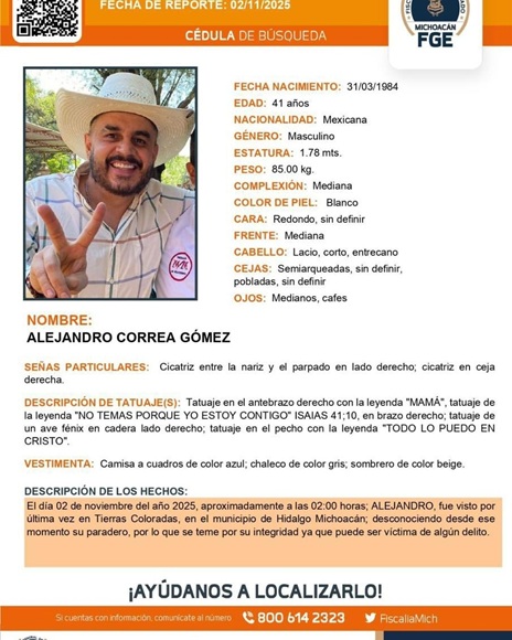 03.11.2025 La Fiscalía General del Estado de Michoacán (FGE) emitió una cédula oficial de búsqueda para localizar a Alejandro Correa Gómez, expresidente municipal de Zinapécuaro, quien fue reportado como desaparecido la madrugada del 2 de noviembre de 2025. De acuerdo con el comunicado de la FGE, Correa, de 41 años de edad, fue visto por última vez alrededor de las 2:00 horas en la localidad de Tierras Coloradas, perteneciente al municipio de Hidalgo, sin que hasta el momento se conozca su paradero.