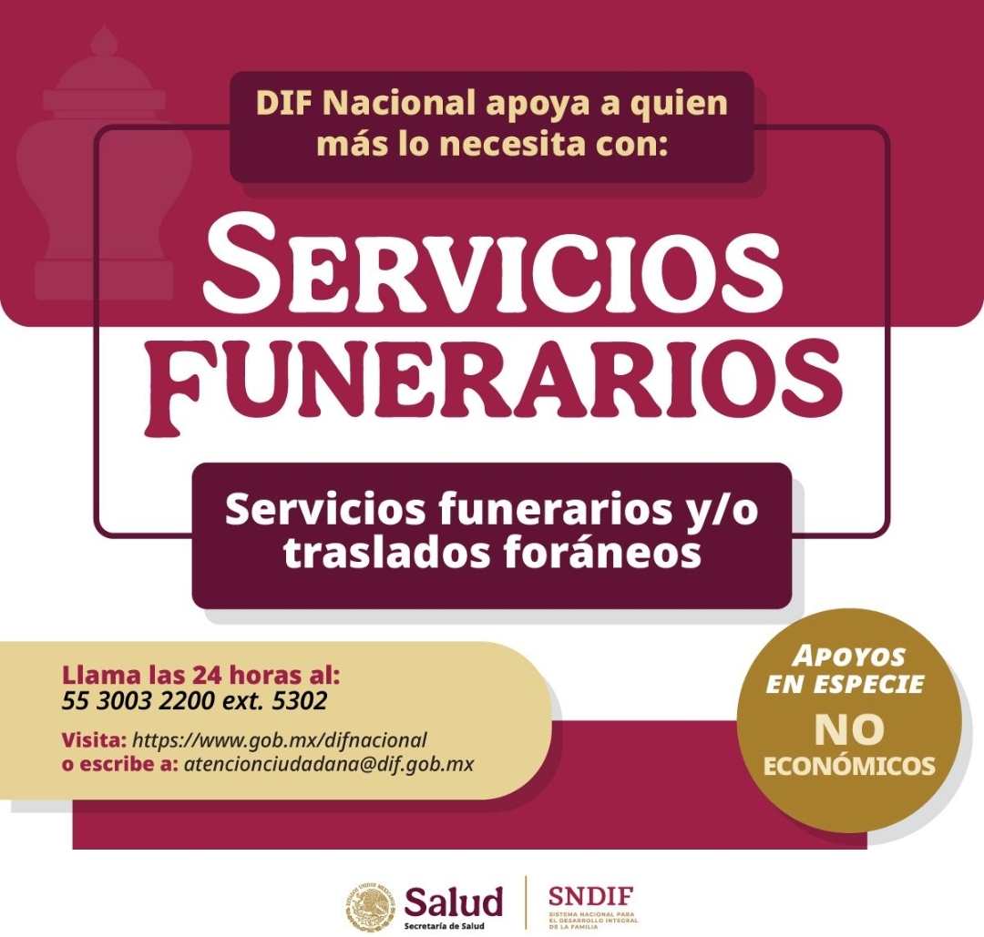 Consideraciones importantes: El SNDIF no entrega apoyos monetarios ni cubre gastos por conceptos como: vestimenta, fosa, gaveta, columbario, nicho u otros servicios similares. Tampoco está autorizado para realizar repatriaciones internacionales.