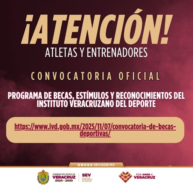 09.11.2025 Veracruz, Ver.- El Gobierno del Estado, a través del Instituto Veracruzano del Deporte (IVD), publica la Convocatoria del Programa de Becas Deportivas del periodo 2025-2026, dirigida a los atletas y entrenadores del deporte convencional y adaptado.