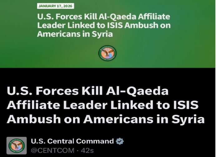 17.01.2026.- EUA.- El Comando Central de Estados Unidos confirmó este sábado la muerte de Bilal Hasan al-Jasim, considerado un líder terrorista vinculado al Estado Islámico, durante un ataque aéreo en el noroeste de Siria. La operación, denominada Ojo de Halcón, se llevó a cabo como represalia por la emboscada del 13 de diciembre de 2025 en Palmira, donde murieron dos soldados estadounidenses y un intérprete civil.