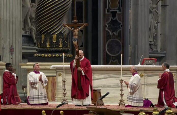 *En la homilía de la Celebración de la Pasión del Señor, presidida por León XIV en la basílica de San Pedro, el predicador de la Casa Pontificia muestra cómo Jesús encarnó la figura del «Siervo del Señor» cantada por el profeta Isaías, introduciendo en la historia una nueva lógica: «En una época desgarrada por el odio y la violencia», los cristianos «deponen las armas» y confían en la Cruz.