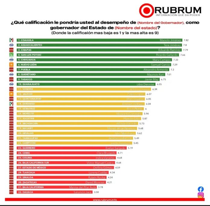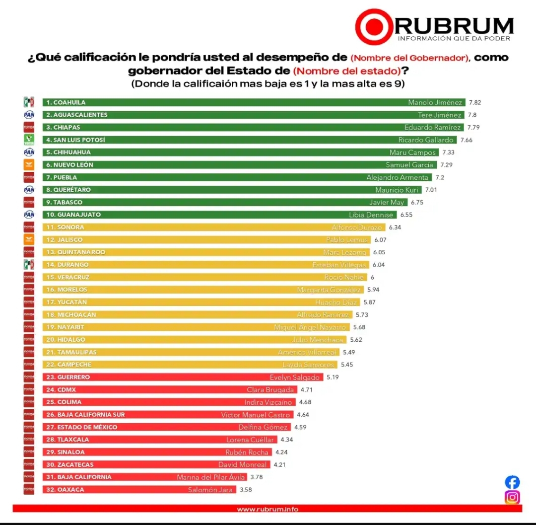 Pues nada mi gente, que la más reciente Evaluación Ciudadana a Gobernadores elaborada por RUBRUM, la famosa casa encuestadora, confirma que Veracruz mantiene una percepción estable y equilibrada, bajo el liderazgo de la gobernadora Rocío Nahle García, consolidándose así como una entidad que avanza con orden, responsabilidad y rumbo claro durante su primer año de gestión.