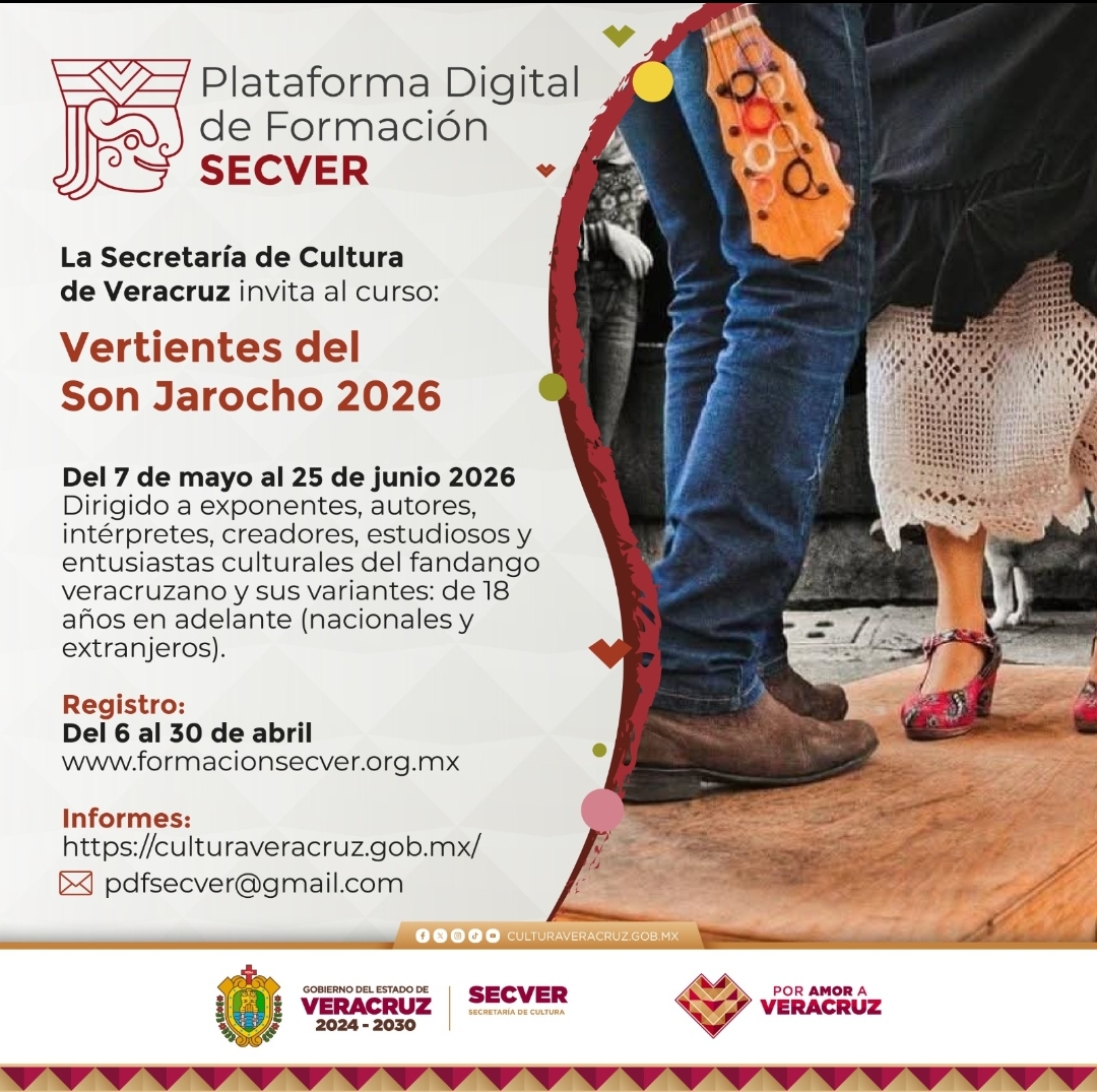 Xalapa, Ver., 10 de abril de 2026.- La Secretaría de Cultura de Veracruz (SECVER) invita a participar en el Diplomado en Gestión Cultural 2026 y el curso Vertientes del Son Jarocho 2026, que se impartirán a través de la Plataforma Digital de Formación SECVER. Ambos programas requieren inscripción previa.