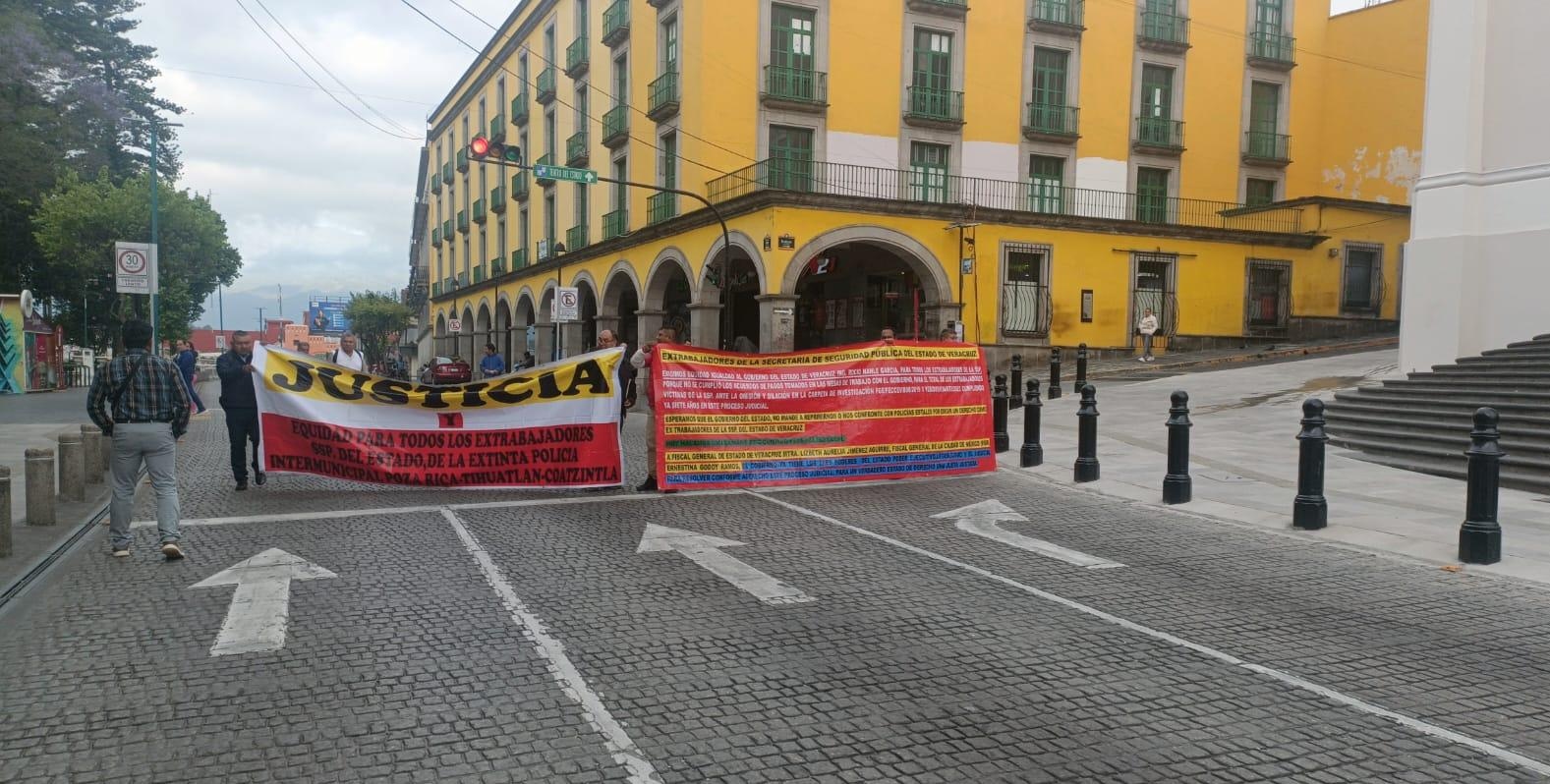 14.04.2026 Xalapa, Ver.- Un grupo de ex trabajadores de la extinta policía intermunicipal de Poza Rica, Tihuatlán y Coatzintla se manifestó nuevamente en la capital del estado para exigir el pago pendiente derivado de un acuerdo de mediación con el Gobierno estatal, así como una solución ante la presunta pérdida de su expediente en la Fiscalía. Como medida de presión, los inconformes bloquearon la calle Enríquez, en el centro de la ciudad.