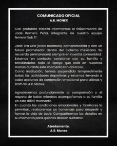 La noticia fue confirmada por el equipo A.R. Monex mediante un comunicado oficial en el que expresaron su profunda tristeza por la pérdida de la joven deportista.