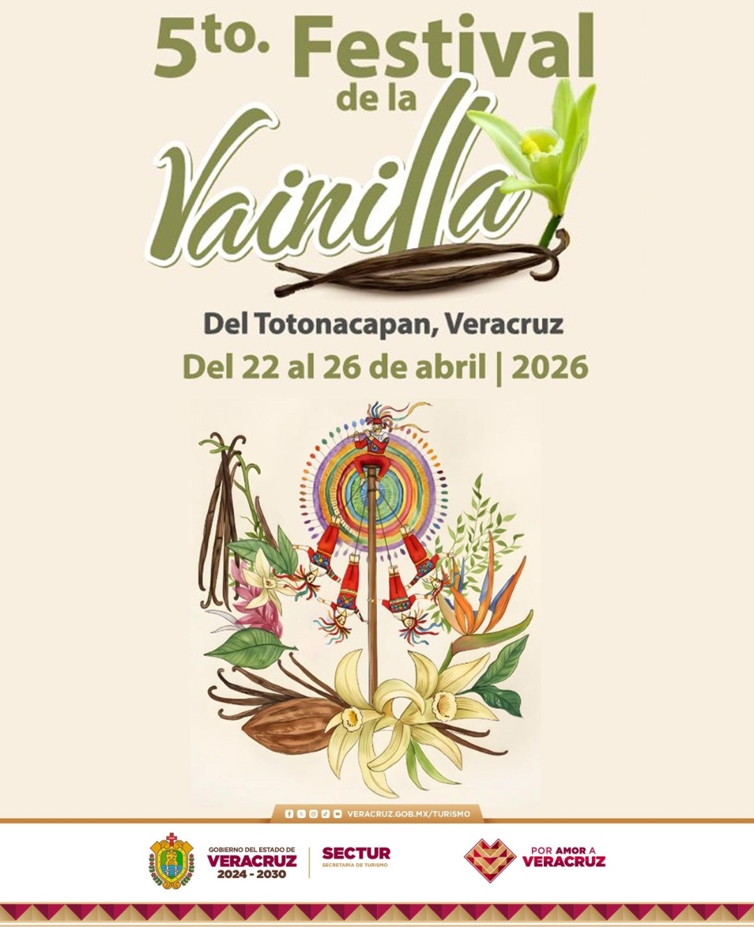 Xalapa, Ver., 17 de abril de 2026.– La Secretaría de Turismo invita a disfrutar del 5.º Festival de la Vainilla del Totonacapan, que se llevará a cabo del 22 al 26 de abril en Papantla, Poza Rica, San Rafael y Gutiérrez Zamora, con una programación cultural, gastronómica y académica que reconoce el valor de este producto emblemático de Veracruz.
