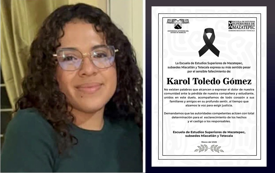 05.03.2026 Cuernavaca, Morelos.- La Fiscalía General del Estado de Morelos informó que los estudios periciales realizados al cuerpo localizado en la carretera Coatetelco-Miacatlán permitieron establecer que se trataba de Karol Toledo Gómez, estudiante de Derecho en la Universidad Autónoma del Estado de Morelos (UAEM), desaparecida desde el 2 de marzo. La institución aseguró que agotará todas las líneas de investigación para esclarecer el caso y dar con los responsables.