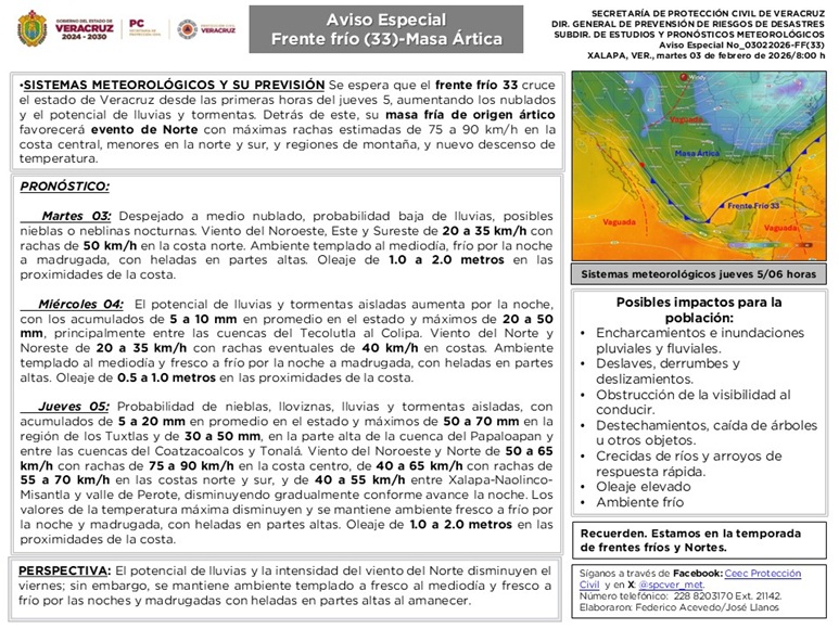Xalapa, Ver., 4 de febrero de 2026.- El frente frío 33 ha ingresado al noroeste del Golfo de México y se espera que cruce el estado de Veracruz de esta noche a la tarde del jueves 5, aumentando los nublados y el potencial de lluvias y tormentas. Detrás de este, su masa fría de origen ártico favorecerá un evento de Norte con rachas máximas estimadas de 75 a 90 km/h en la costa central, menores en la norte y sur, y regiones de montaña. Después de este evento, en los siguientes 5 a 7 días, no se observa el paso por el estado de Veracruz de otro frente y masa fríos.