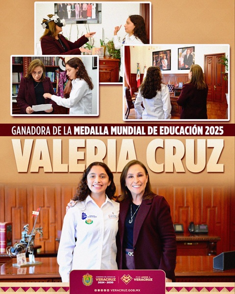 “Por supuesto, recibir en la oficina de palacio de gobierno a Valeria Palacios Cruz es un orgullo y satisfacción, estudiante veracruzana que recibirá en Londres la medalla mundial de educación 2025. Muy inteligente y talentosa. Hay relevo generacional”, esscribió la mandataria.