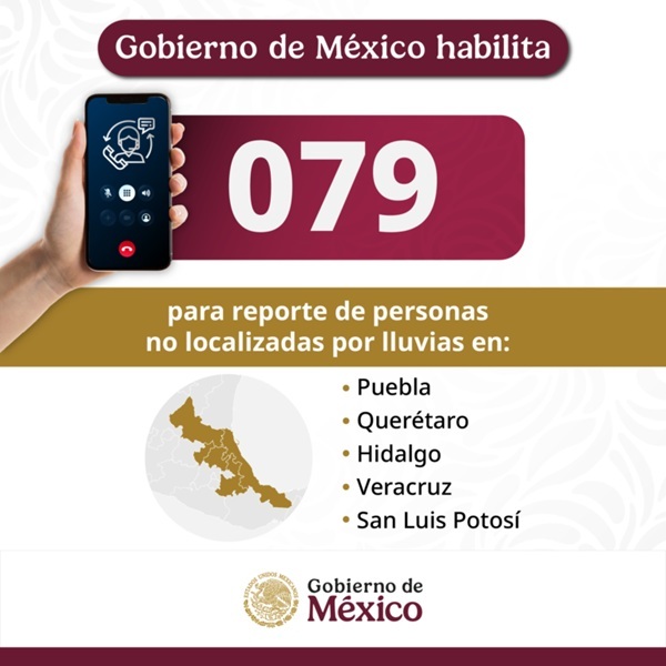 * El Gobierno de México en coordinación con gobiernos estatales habilitó el 079 para reportar personas no localizadas tras las lluvias en Puebla, Hidalgo, Veracruz, Querétaro y San Luis Potosí. Los tres órdenes de gobierno trabajan unidos para apoyar a las familias afectadas.