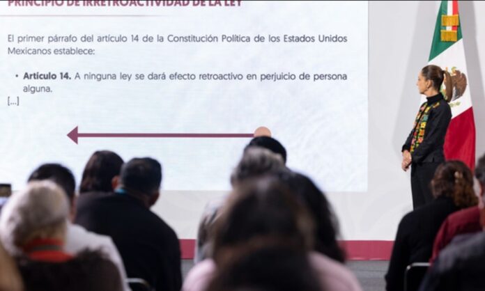 En la conferencia matutina: “Las mañaneras del pueblo”, la Presidenta de México, Claudia Sheinbaum Pardo, pidió al coordinador general de Política y Gobierno, Arturo Zaldívar Lelo de Larrea, explicar el posicionamiento de su administración: se debe respetar el Artículo 14 de la Constitución, el cual establece que no debe haber retroactividad en las leyes.