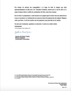 “En tal virtud, le proponemos a usted insertar en la página legal de dicha obra una anotación en la que se reconozca su colaboración en el proceso inicial de preparación del original. Háganos saber, por favor, si está de acuerdo con esta propuesta, para proceder en tal sentido”.